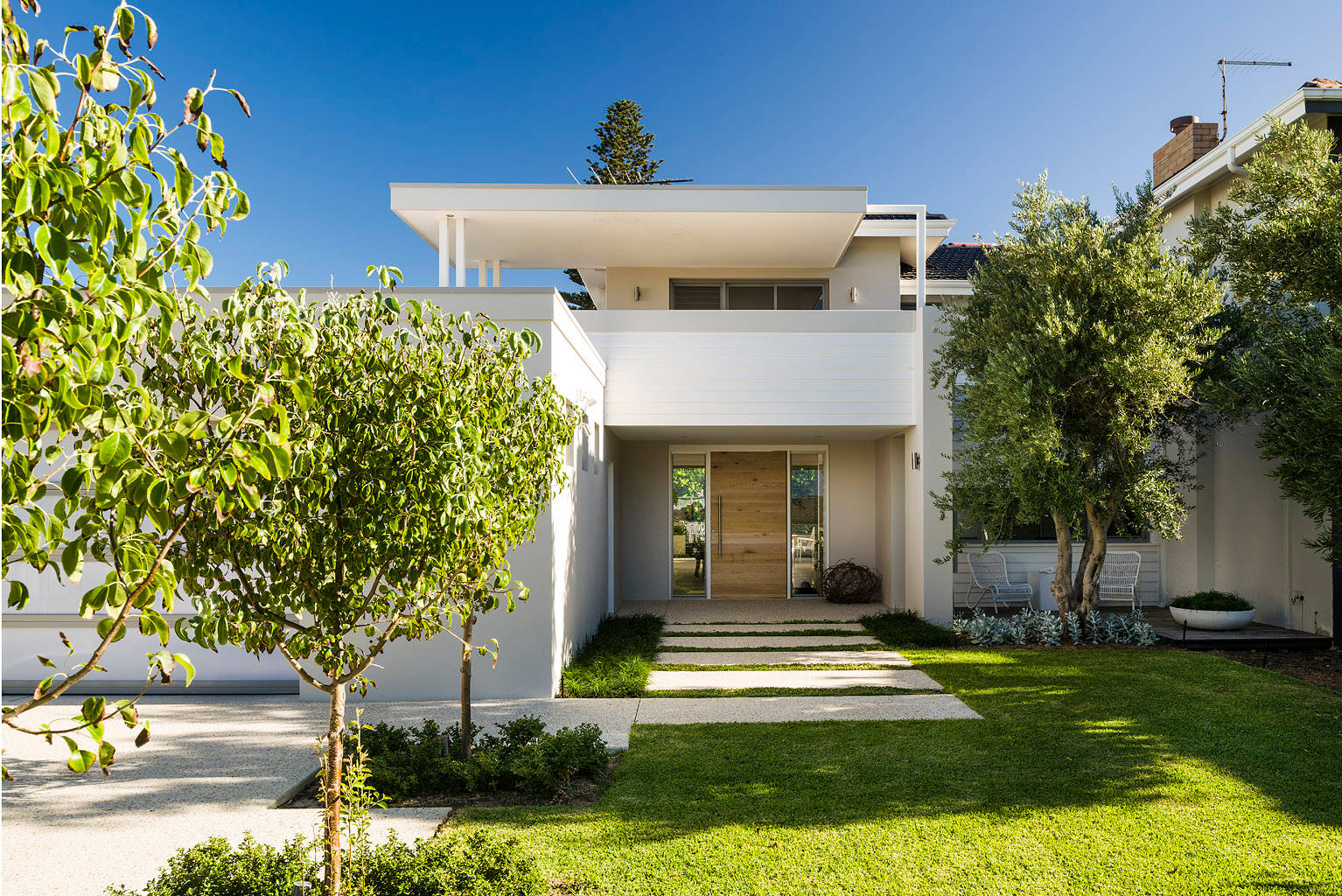 Now on the other side of the path, to create some privacy for the people inside from those people walking up the path, they’ve put in some long narrow planters and used Ficus Flash to create a hedge. It’s been trimmed quite tight so it’s only about 50 cm thick, but it makes a beautiful thick privacy screen. You can tell it’s a Ficus Flash because it has these slightly curly leaves.