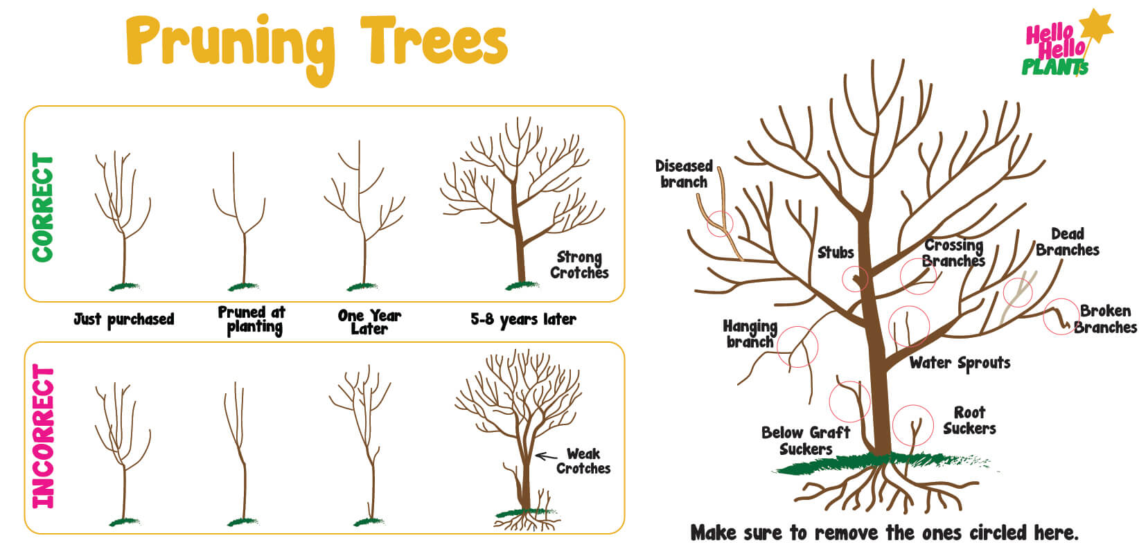 Most deciduous flowering and fruiting trees will require formative pruning upon planting (see below). Continual formative pruning will be required for the following 2-3 years, after which the tree will begin to take its shape. Pruning after this is to maintain the desired shape, remove overlapping or inward facing branches and to remove diseased, damaged or dying wood.