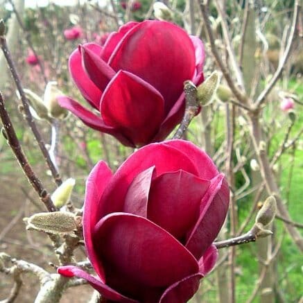 A lovely little tree or shrub form, the Magnolia ‘Nigra’ is best suited to small gardens. pots and containers. Its dark, rich purple blooms form in spring with leaves appearing later.