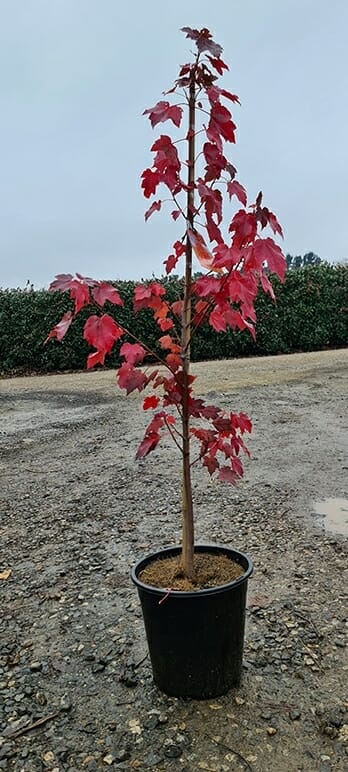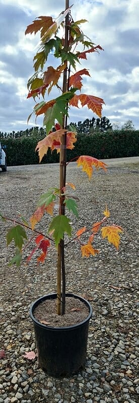 Acer rubrum is a tall straight trunked tree with beautiful lobed and veined matt green leaves. The bark is grey, thin and smooth. The foliage will turn fantastic to shades of scarlet and gold in autumn before shedding its leaves for winter. Prefers deep, organic materials rich soil though will grow in most soil conditions.