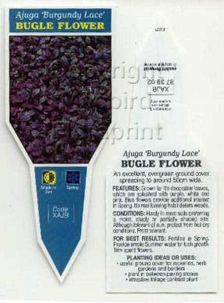 Burgundy Lace is a great low maintenance groundcover. It has coloured leaves with shades of purple, white, silver, cream, red or pink. In Spring to early Summer, the Ajuga produces lavender coloured flowers that pop up above the carpet of leaves.