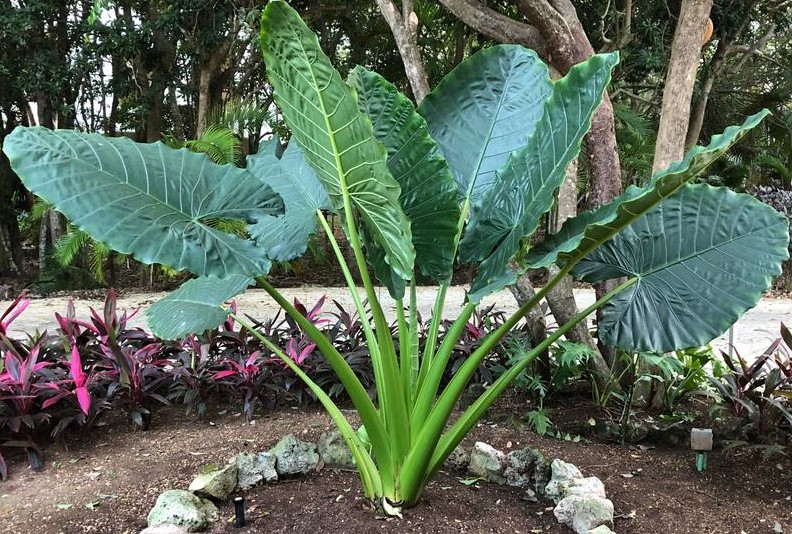 They are also called Giant Taro, large, glossy emerald green leaves up to one metre long held high. The striking leaves have prominent veining on the underside of the leaves and provide great swathes of colour contrast as a background to lower flower borders. They also go well in pots or tubs but may only reach one to a half metres in height.
