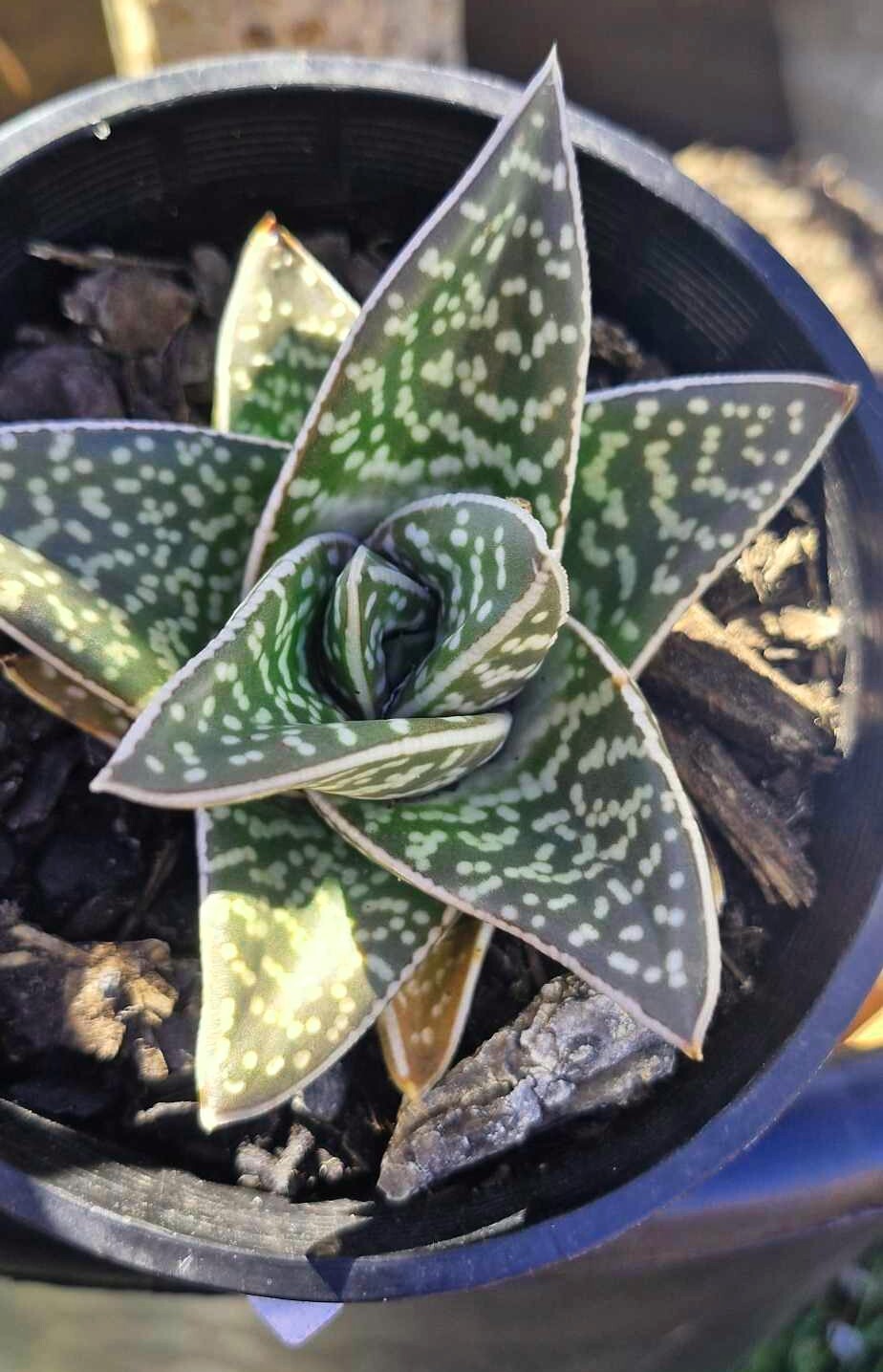 Tiger Aloe, a fascinating stem-less dwarf aloe growing to 30cm x 30cm. Green foliage is attractively white/light green banded. Orange/pink flowers on slender stalks around spring time.