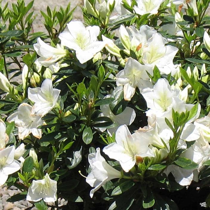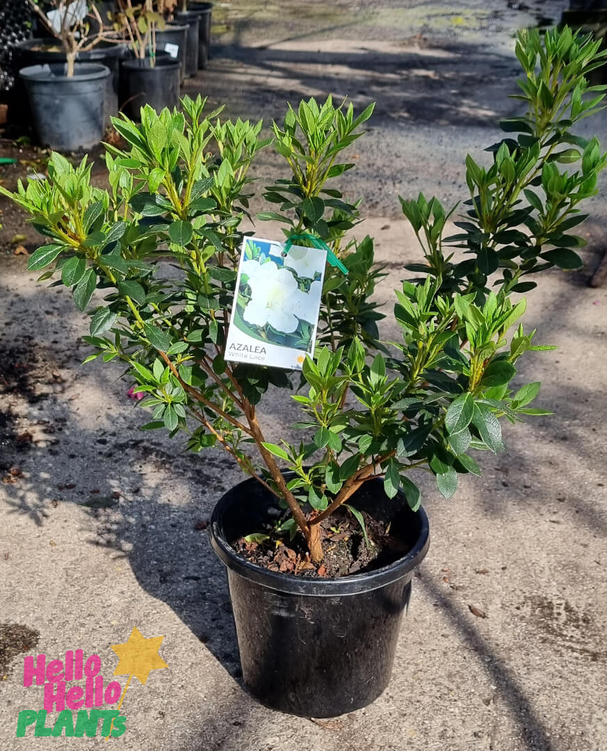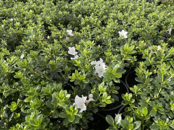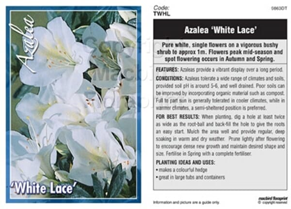 White Lace Azalea is a dark green, evergreen shrub that produces masses of large pure white blooms from spring to autumn. A perfect border plant for garden beds, underneath trees, in pots in a morning sun part shady position with acidic soil. Mature growth: 1x1m.