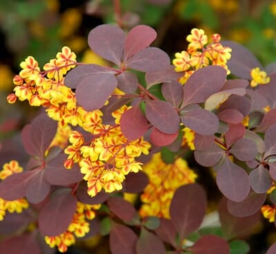 Rounded oval leaves that are reddish burgundy and turn to a gorgeous red each autumn. In spring, clusters of pale yellow flowers edged in red dangle from the spiny twigs. After bee pollination, the flowers produce small oval red fruits.
