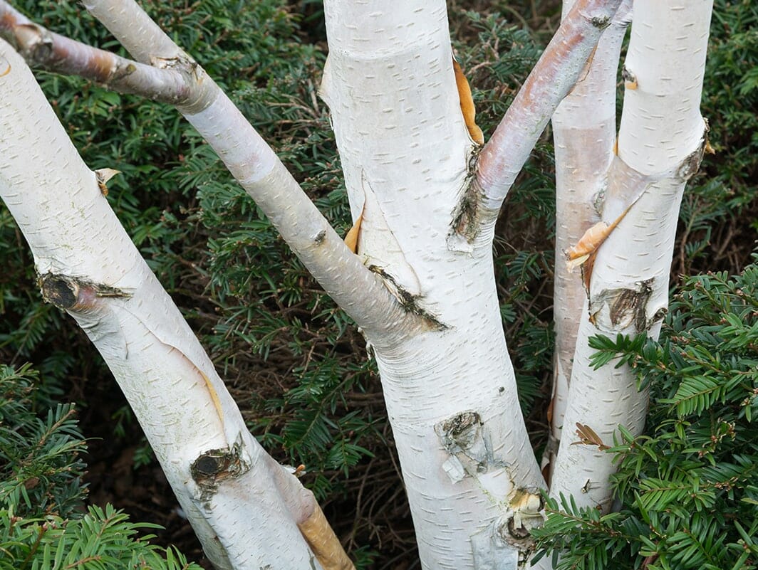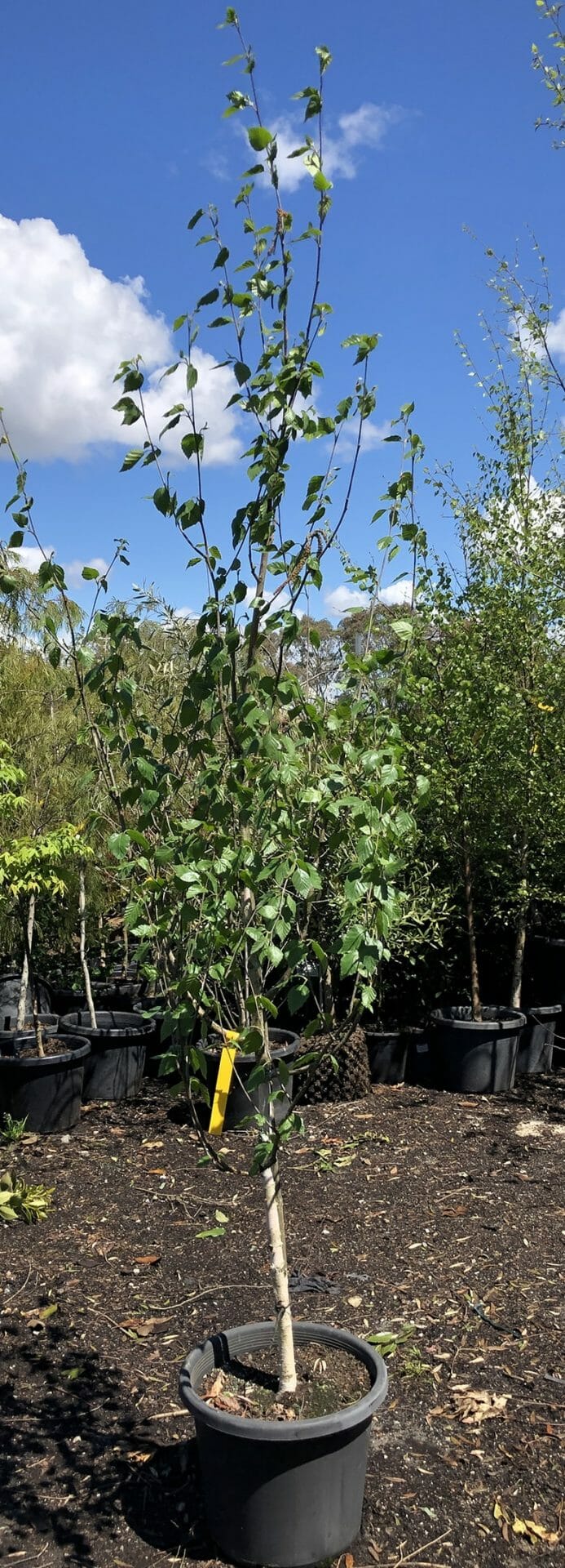 A beautiful, highly ornamental Birch with brilliant creamy-white peeling bark. Dark green, ovate leaves which turn yellow in autumn. Produces catkins that hang from the tree. They look beautiful planted in groups of 3 or 5 and are perfect for formal, modern or even as specimen trees.