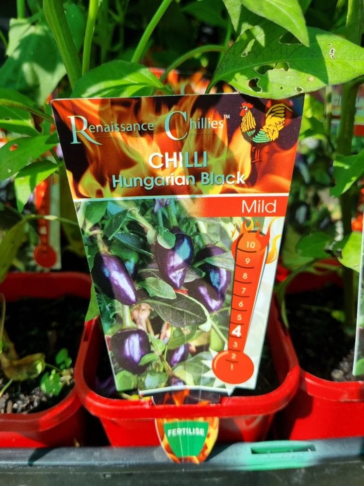 Hungarian Black is a rare and colourful hungarian heirloom chilli. It starts with a purple flower progressing into a green, black then red chilli that resembles the jalapeno. Protect from strong winds and frosts.