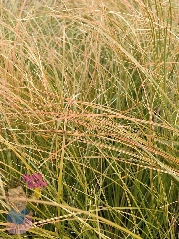 A fine foliage clumping grass with long, wispy blades of vibrant orange.