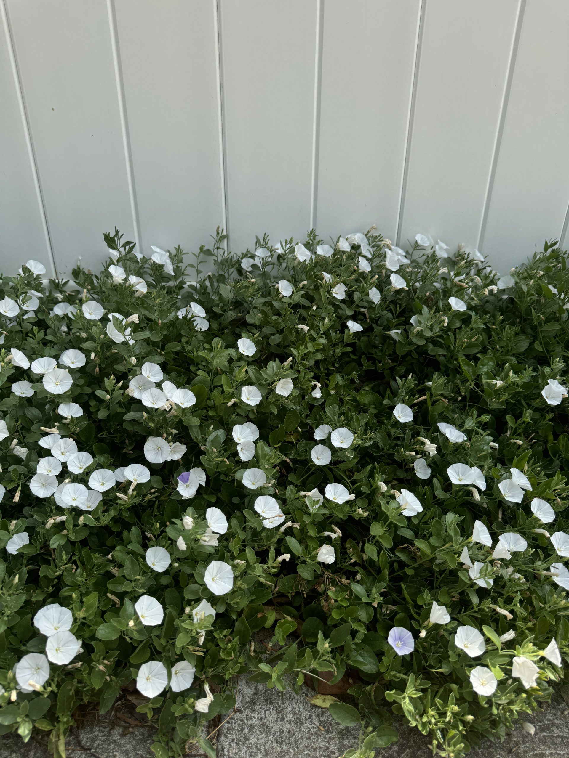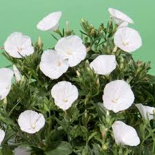Convolvulus Prime White is a mounding, non invasive, ground cover that covers those difficult to maintain places. The bright white flowers appear in early spring and continue until early autumn. Mature growth: 30cm h x 30cm wide.