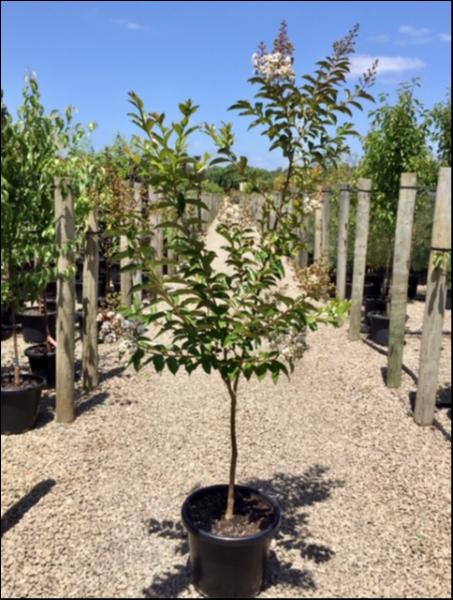 Natchez Crepe Myrtle is a deciduous tree creates great interest throughout the year. In summer, clusters of spectacular white, crepe-paper like flowers are produced. Following this, the dark green leaves add further interest as they transition into autumn, turning a rich bronzy red colour before falling. Bark also provides colour as the tree matures, with it’s flakiness revealing the rich, brown underbark. A beautiful growth habit and resistant to mildew, this variety will tolerate periods of dryness once established. Mature growth: 7-9m tall x 4-5m wide.