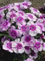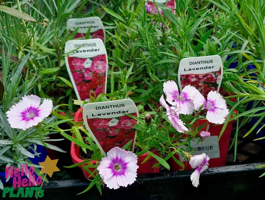 Dianthus Lavender (Carnation) is a compact, mound-forming, evergreen perennial with narrow, dark green leaves and, throughout summer, fragrant, white to pale lavender flowers with bright magenta to purple eyes. It is evergreen and a small grower reaching 20cm in height so it is perfect for small borders.