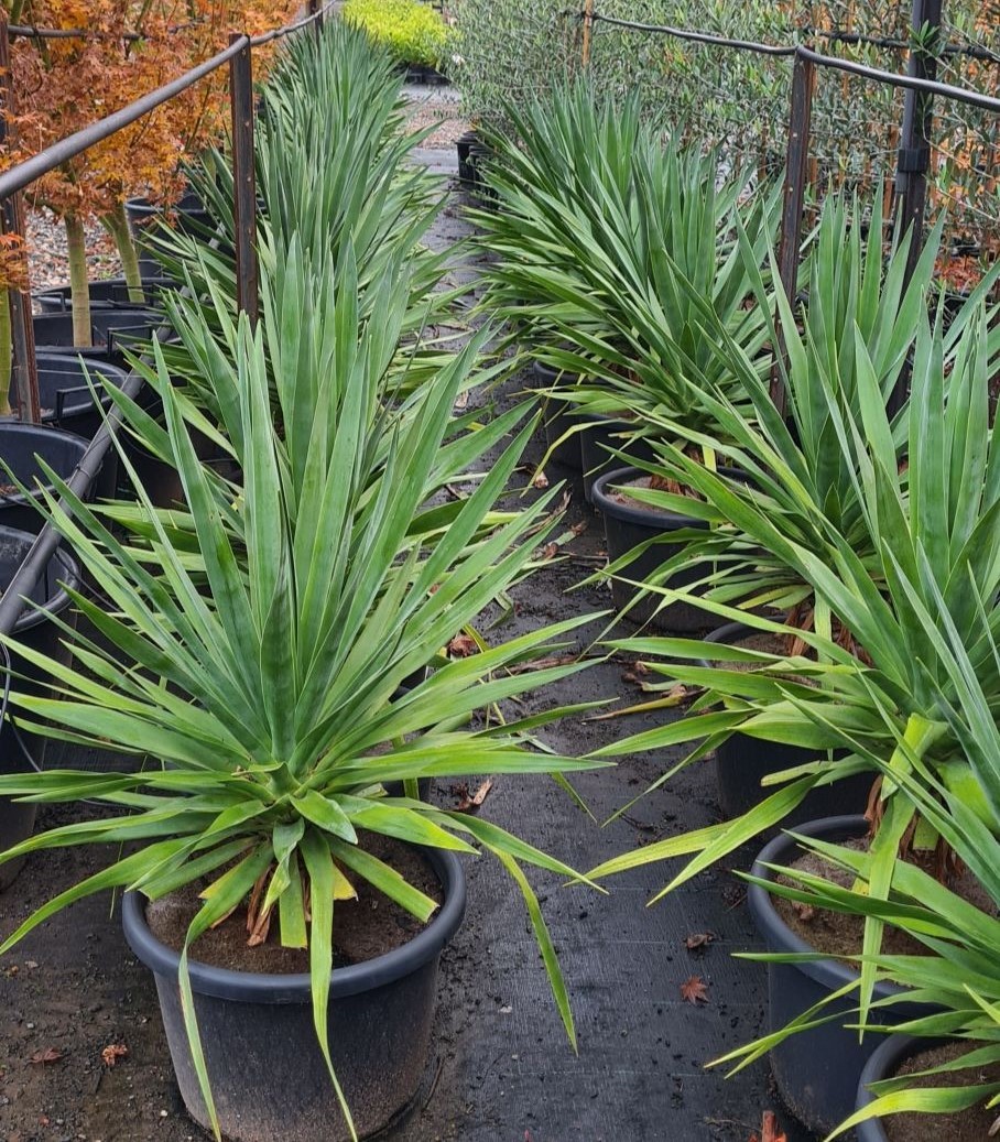 The ends of the thick branches hold bunches sword-shaped blue-green leaves. In early Summer appear the greenish-white flowers that are then followed by orange berries. Can be planted in either sun or shade, has low water needs and is drought tolerant.