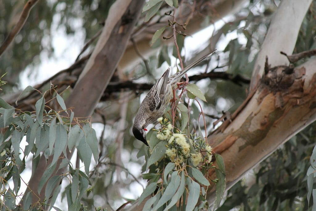 Western Grey Box Gum, is a bigger tree growing to 25m tall, with narrow green foliage. It has a grey trunk with white patches and flaky bark that sheds in short ribbons. The name microcarpa comes from Greek ‘micros’ meaning small, and ‘carpos’ meaning fruit, referring to the small fruit it produces.