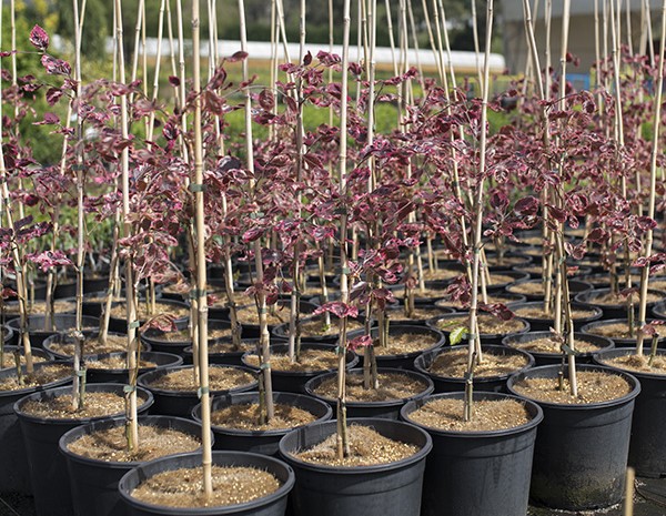 Beeches are large, long-lived deciduous trees native to England and Europe. They are great, low-maintenance big, elegant trees. Tricolour Beech trees bear fresh purple and pink variegated foliage that changes to rich golden color in Autumn, with smooth grey bark. The bark is a favourite for name carving and many of the Beech trees you’ve seen probably have young lovers’ names etched into them for eternity (or the life of the tree).