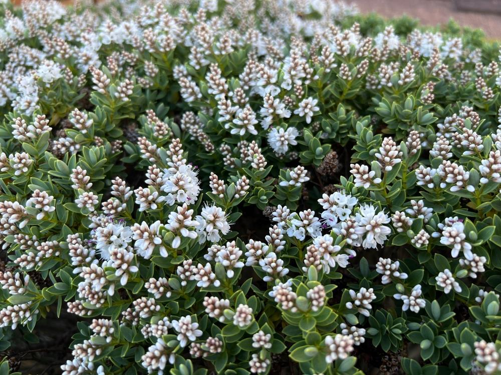 Wiri Mist Hebe is an attractive native shrub with green foliage and delicate white flowers in late spring – early summer. Mature growth: 50cm-1m hxw