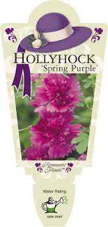 Spring Purple Hollyhock is a compact perennial plant that flowers on a single stem. It has frilly double purple flowers appear in summer time. Plant in a sunny position in normal free draining garden soil. Choose a position that is out of the wind. Mature growth: 60cm h x 45cm wide.