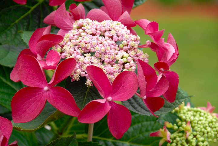 Hydrangea ‘Strawberries and Cream’ is a stunning deciduous shrub admired for its large mophead blooms that open creamy white and blush to shades of pink and strawberry red. The flowers are beautifully contrasted by lush green foliage, creating a showy display from summer through autumn.