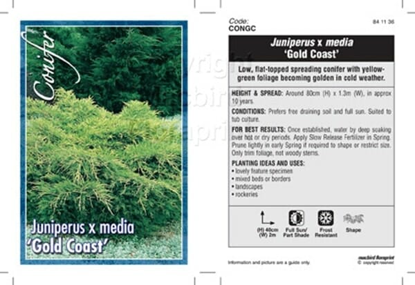 Gold Coast Conifer is a low growing, neat, spreading shrub with green foliage and golden yellow edges. Loves a full sun to part shaded position in well drained soil. Is perfect for deterring weeds. Mature growth 50cm high x 1.5m wide.