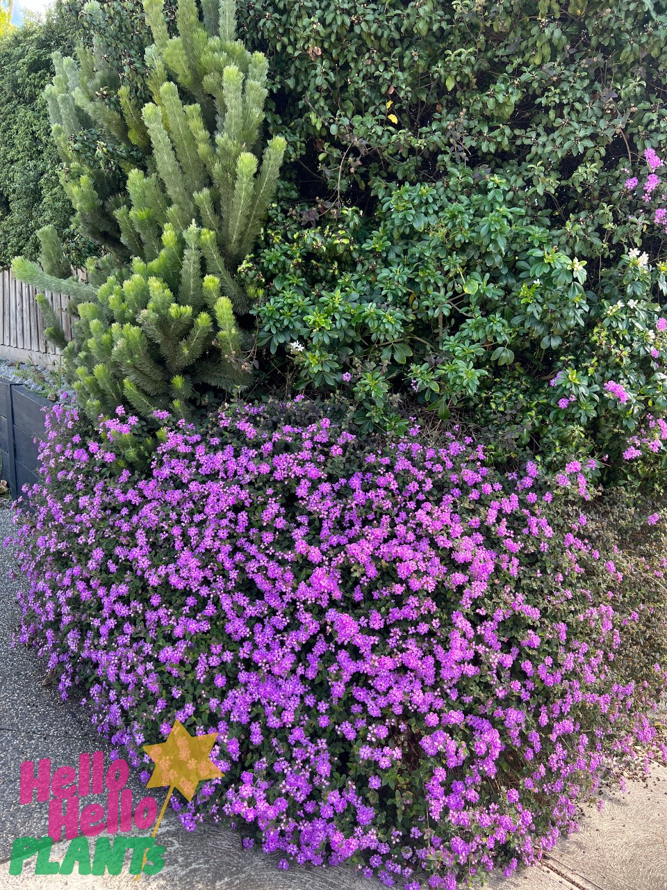 A small evergreen spreading ground cover with masses of mauve flowers all year round but mainly through spring and summer and dark green serrated highly scented leaves. Very hardy and low maintenance, ideal for rockeries, dry areas, containers. It prefers a sunny position, and is drought tolerant. Mature growth: 90cm tall x 1.8m wide