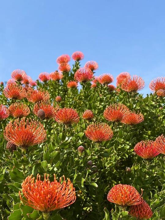 Leucospermum ‘So® Sincere’ is a compact and eye-catching pincushion variety that bursts to life with glowing pink-red flowers accented by yellow tips. Flowering from late winter through spring, its vibrant colour and sculptural form make it a standout in both garden beds and floral arrangements. This hardy shrub thrives in full sun and well-drained soils, offering reliable seasonal colour with minimal upkeep.