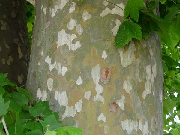The London Plane Tree is a very popular urban tree, due to its pollution tolerance. It has interesting patterned bark which comes off in irregular pieces to reveal different shades of brown and creamy white.