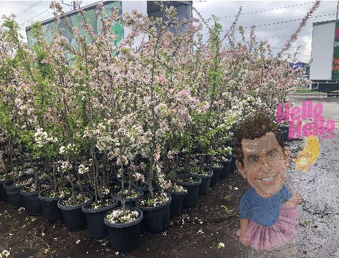 ‘Japanese Crab Apple’ or ‘Showy Crab Apple’, A round-headed, small deciduous tree that has handsome narrow foliage. Impacting crimson buds form white or pale pink flowers that bloom in Spring. Small red and yellow fruit are also produced during Autumn.