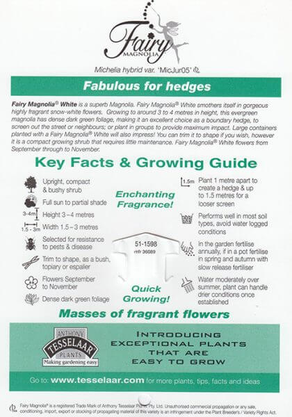 Fairy White is an evergreen hybrid Magnolia, noted for producing large amounts of fragrant white flowers. Perfect for hedging, feature trees or in pots and containers. It has a fast growth habit when planted in full sun to part shade with moist, well drained soil and is frost tolerant. Mature growth 3x3m.