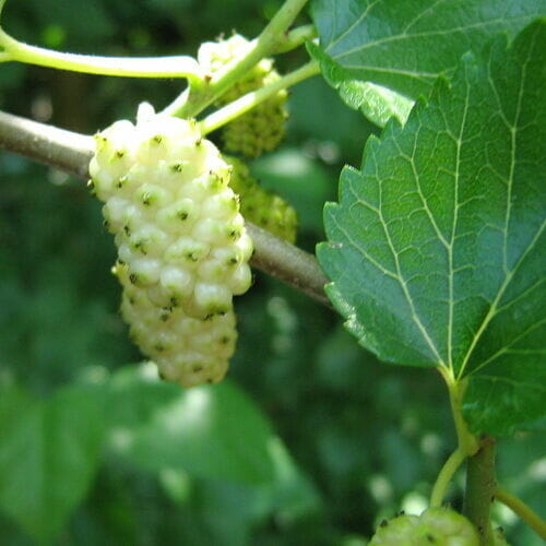 Mulberry White is a fast growing deciduous tree that has attractive large lime green leaves that turn orange in Autumn. It also produces masses of small white to pink fruit that ripen in the Summer and is quite sweet.