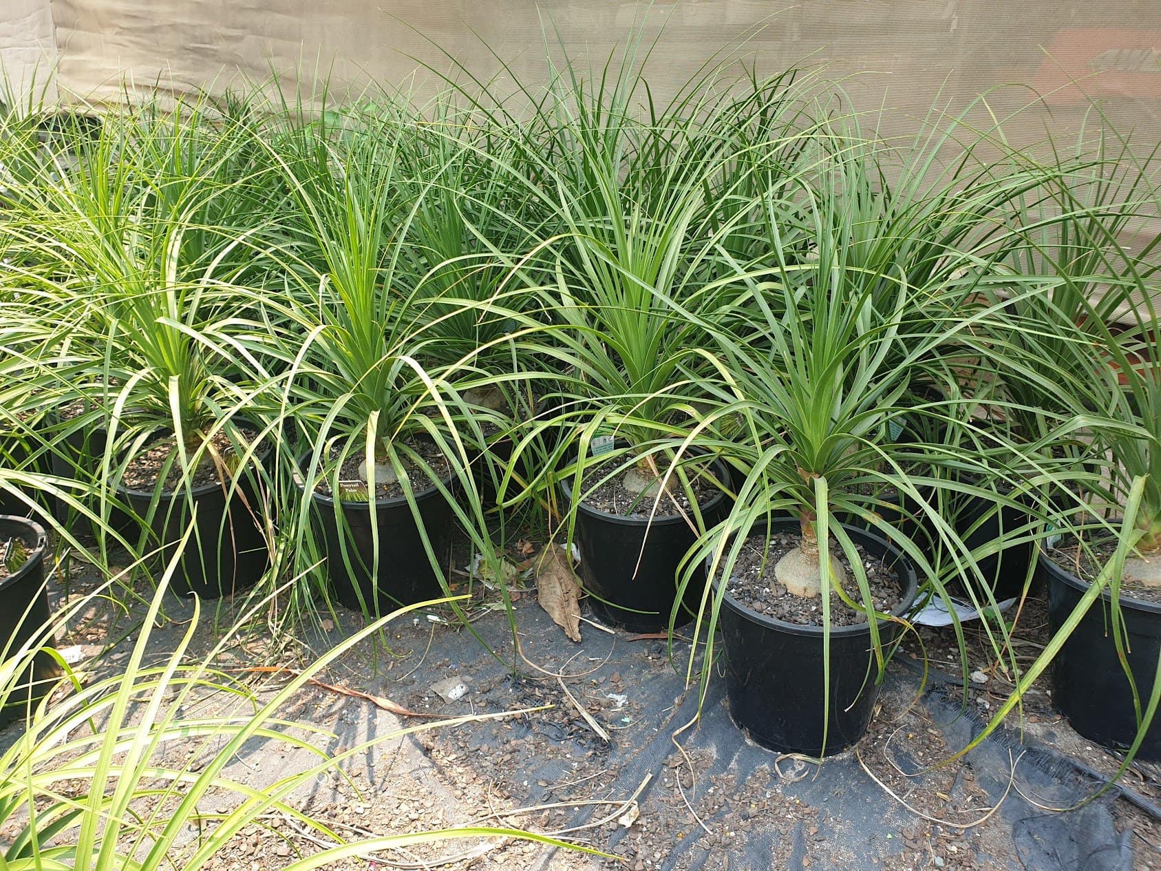 Pony Tail Palms are noted for having a large, swollen, water-retaining base. Its trunk bears thin, flat, palm-like leaves. It is drought tolerant and is best placed in a position of full sunlight. Requires low maintenance.