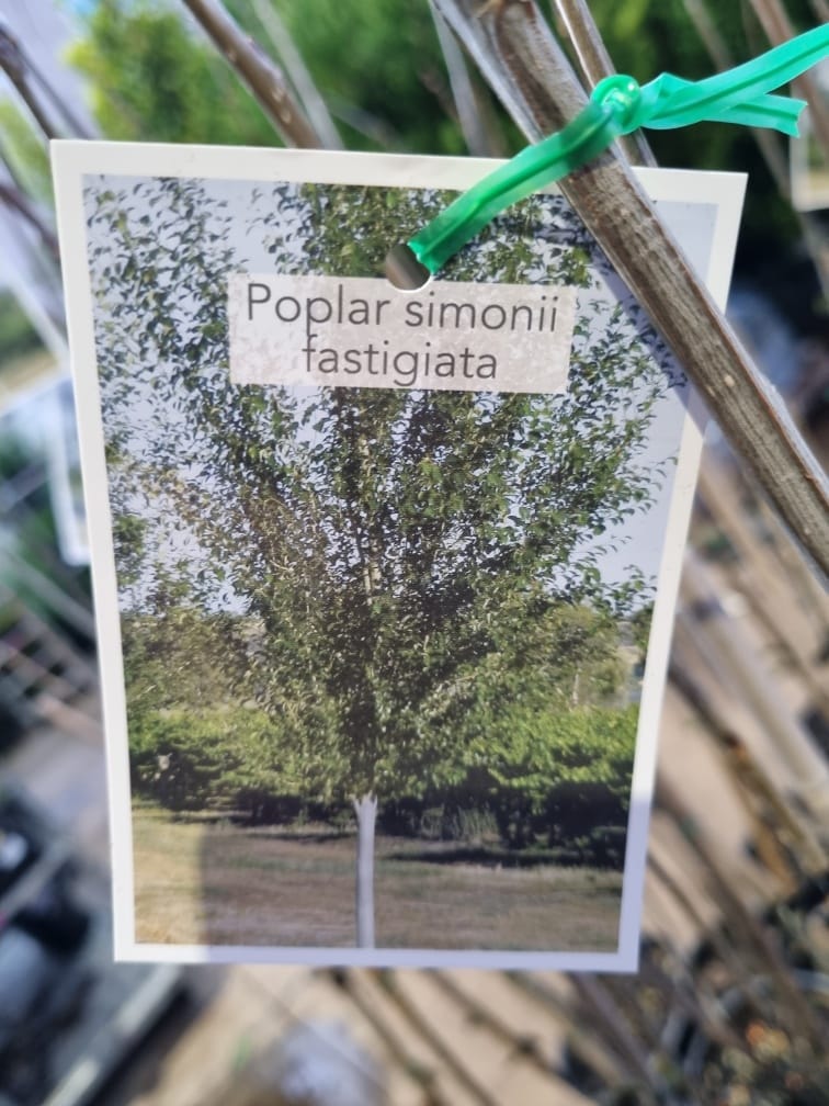 Simon’s Poplar (Chinese Poplar) is a fast growing fastigiate (upright) deciduous tree. It has green shiny leaves that are oval to diamond shaped, with a pale silvery underside. The leaves turn a yellow in the autumn months, before dropping off. Great for decidous screening and avenue plantings. Mature height 8-12m tall x 2-3m wide.