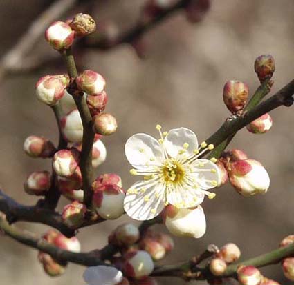 The White Flowering Apricot/Peach, is a small growing, vase shaped tree with green foliage. It produces masses of semi-double pure white blossoms in late Winter to early Spring. Mature growth: 4x3m