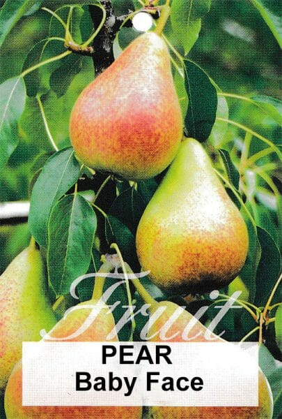 Baby Face fruiting Pear is a small cocktail pear known to be deliciously sweet and juicy with green and red skin. Plant in a full sun position with well drained soil. Water in well and keep soil moist until tree is established.