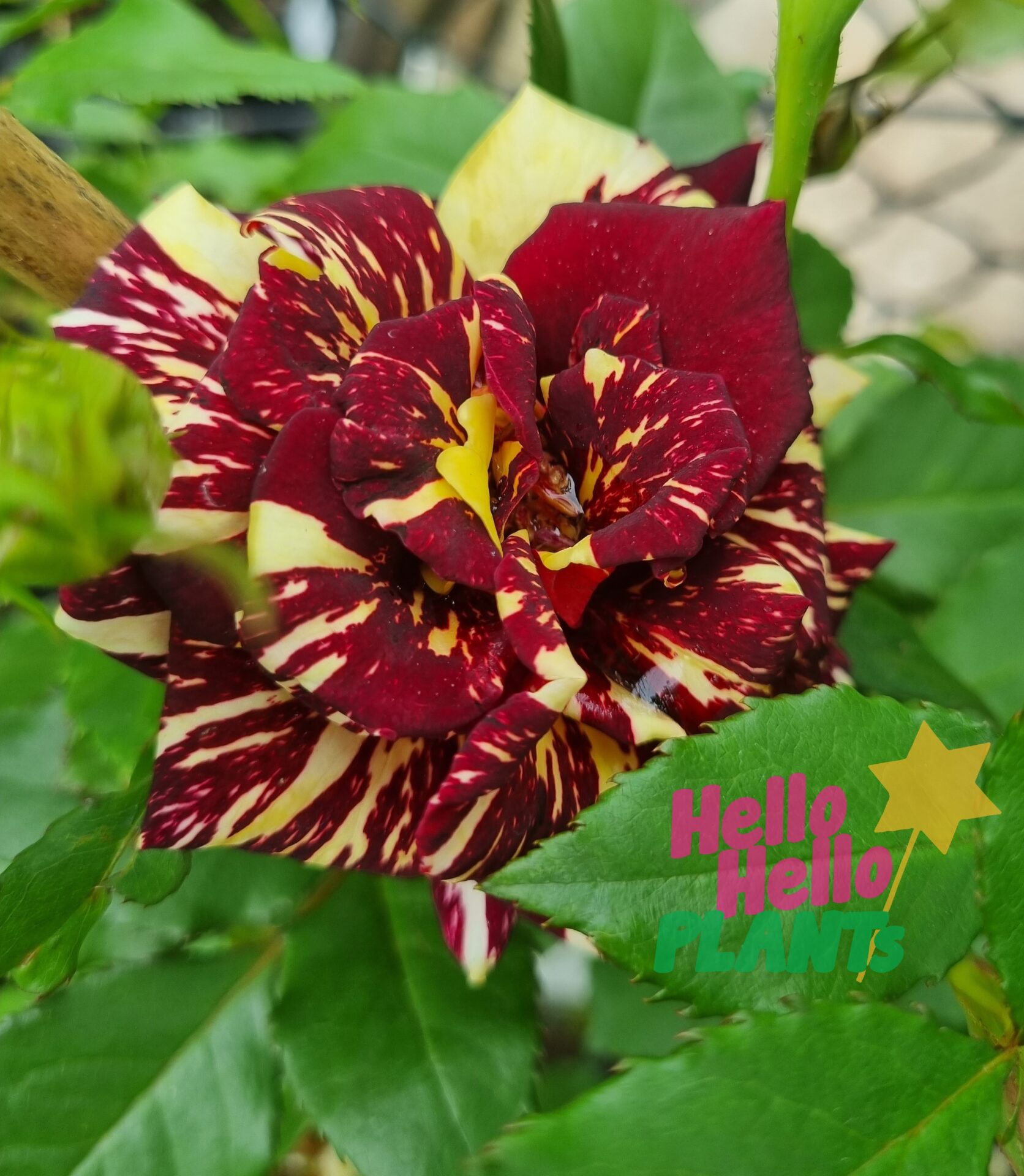 Hybrid Tea Rose Abracadabra is a knock-out with no two blooms the same. A stunning and exciting striped rose, Abracadabra is a burgundy red rose with yellow stripes, or is it a yellow rose with burgundy stripes? Colouration on each petal varies and further variation is seen with changes of the weather.