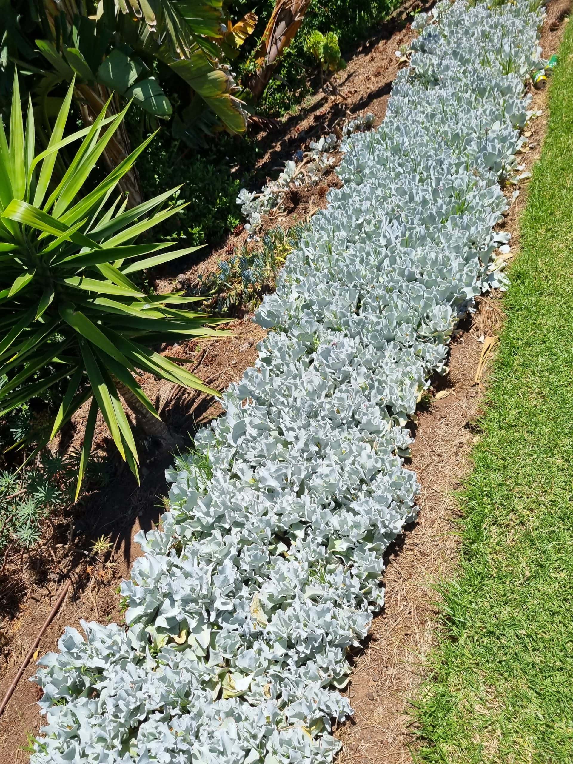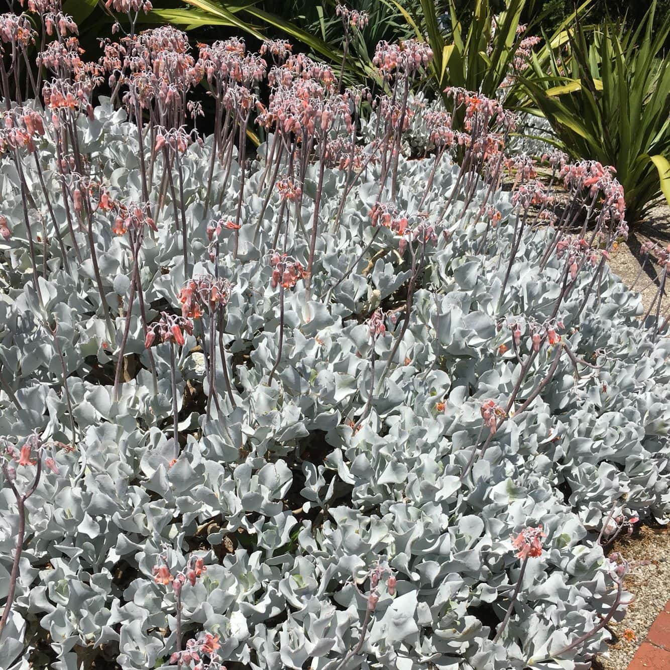 Silver Waves is a species that forms a dense mass of large rippling silvery white foliage coated in a fine white powder. This plant looks fantastic when contrasted with darker plants. It is very hardy and will take the extremes of summer heat and winter cold. Pink flowers on a tall stem. Thrives in a position of full sunlight to part shade.