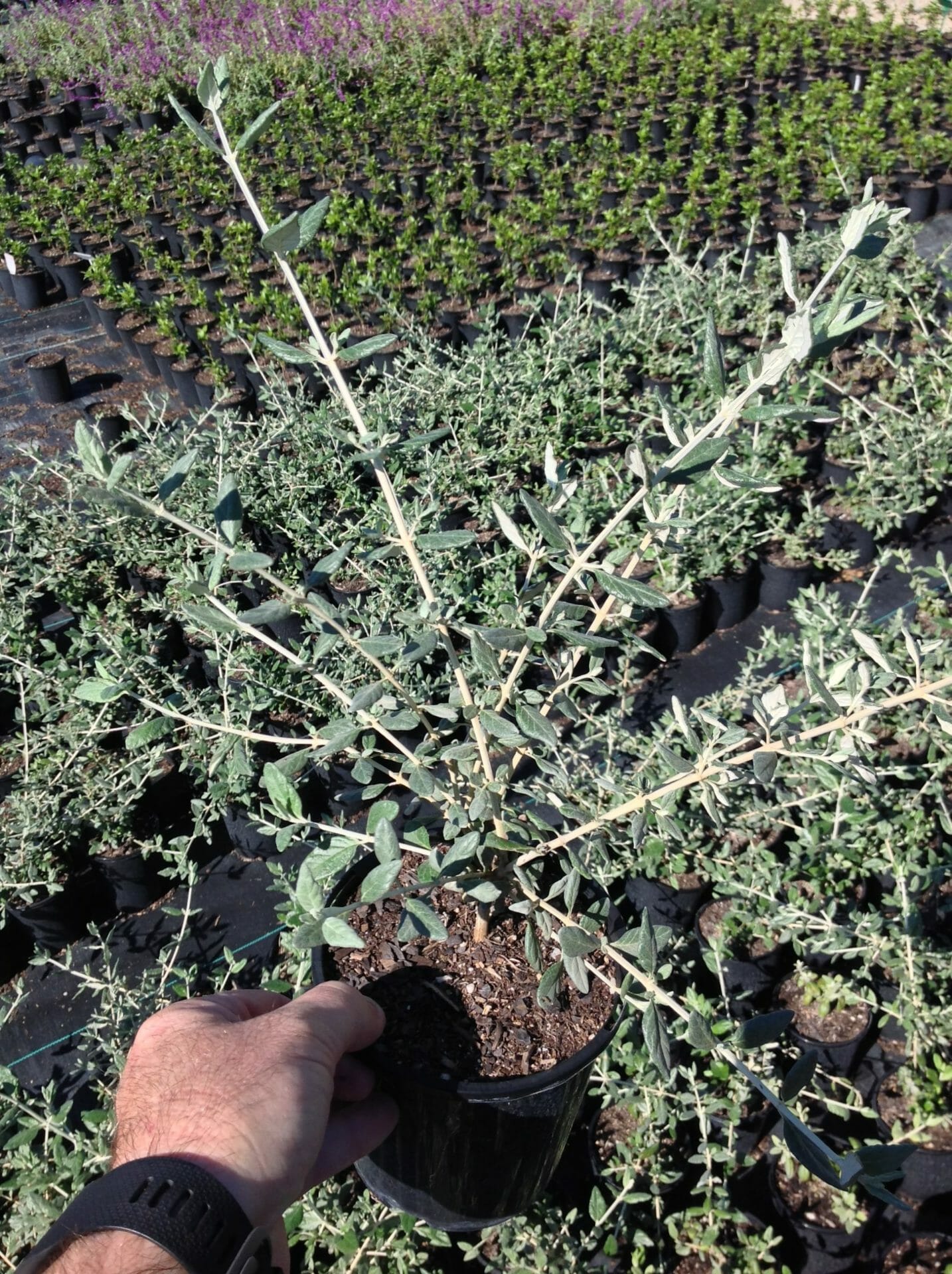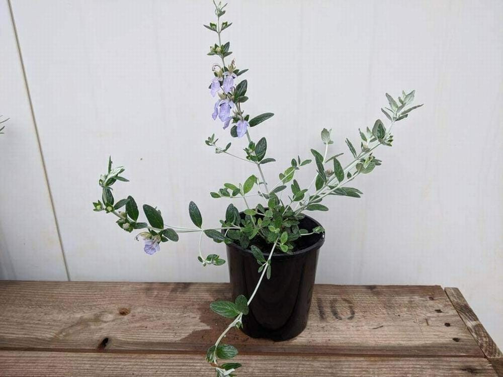 Teucrium fruticans, also known as Germander, is a very hardy small evergreen bush in the mint family with grey stems and undersides of the leaves. Pale lilac blue flowers accent the bush during summer. Prefers a full sun position. It will tolerate the dry inland heat but does very well in coastal areas. Drought tolerant once established. Grown 1.2m x 1.2m
