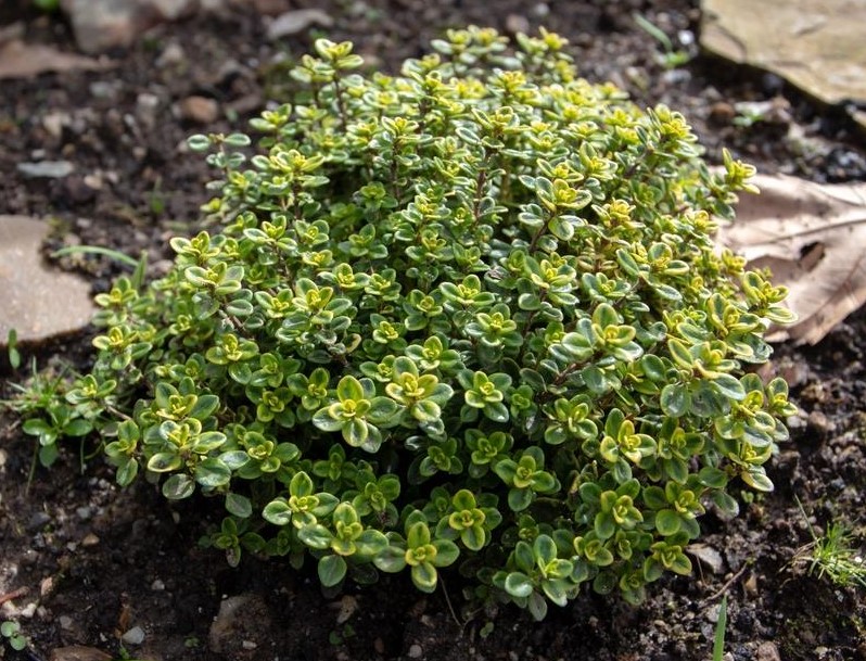 Lemon variegated thyme is a perennial herb typically grown for its edible qualities. The tiny fragrant round green leaves with distinctive gold edges and tinges of creamy white which emerge in spring. The leaves have a savoury taste and a great fragrance.