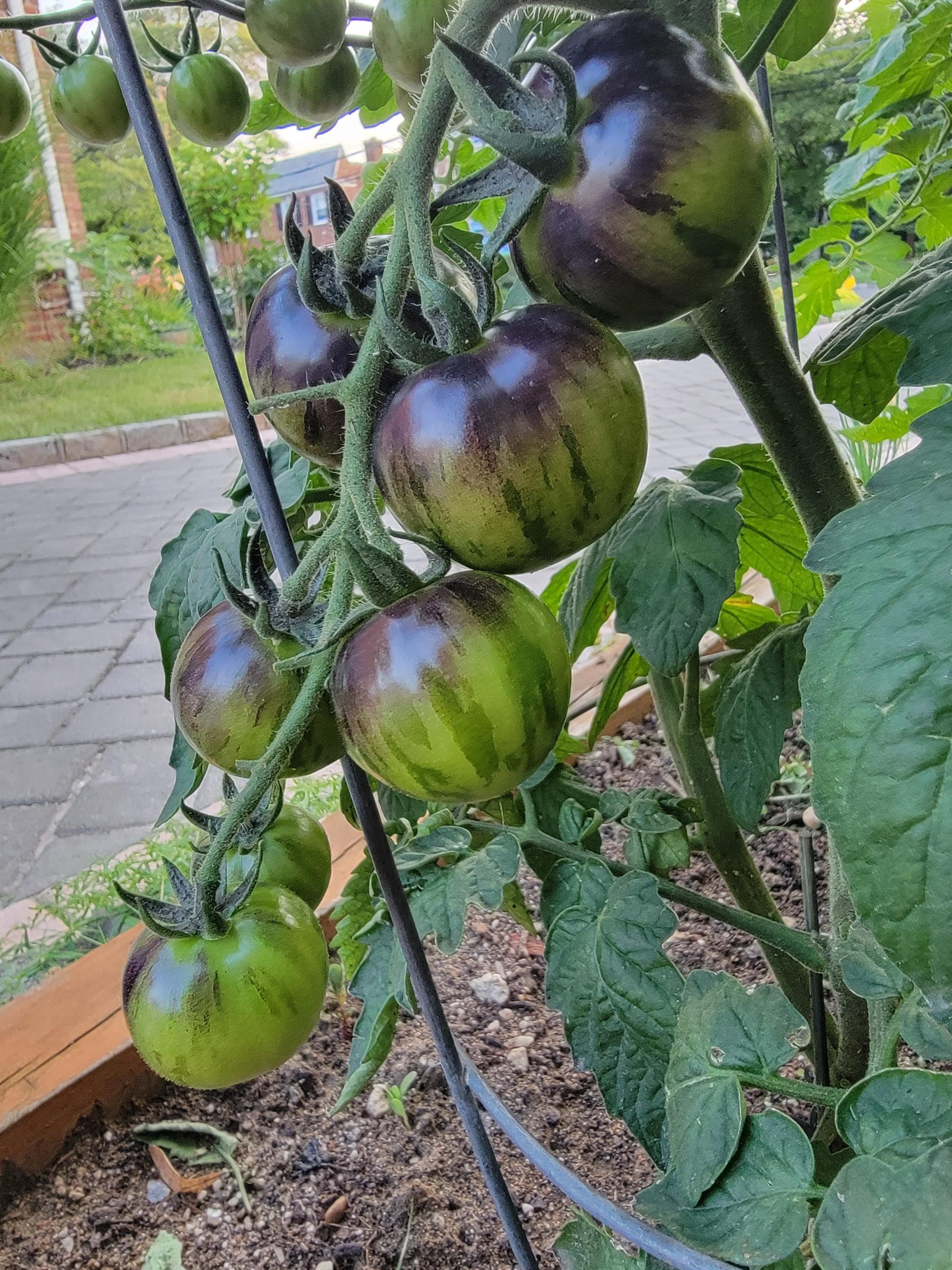 Green and Black tomato produces medium size globe-shaped fruit with green and black fruits with a sweet and tangy flavour and is ideal for salads and sandwiches.