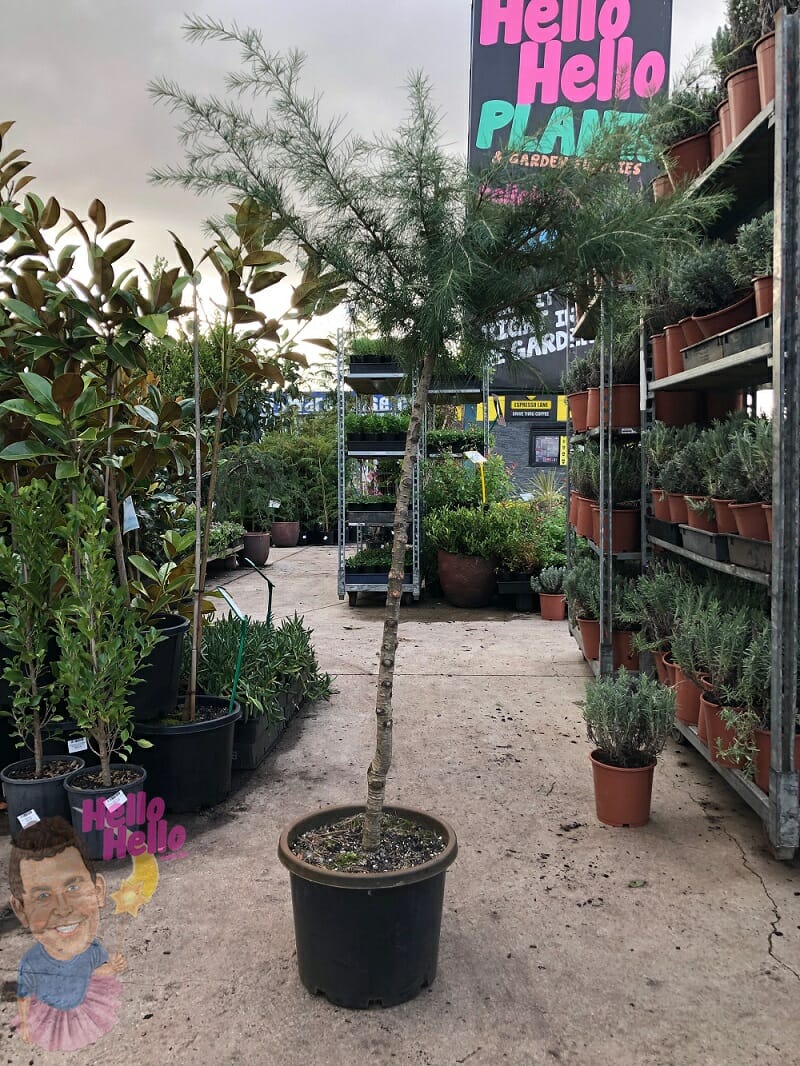 This lovely, unusual Standard is ideal as a feature plant while also looking fabulous in a pot. This evergreen has a natural weeping form, with masses of fine, soft, needle-like, blue-grey foliage, and small male and female seeds in cones, making it an intersting sight. Preferring a well drained soil, it can withstand frost and some drought once it has established.
